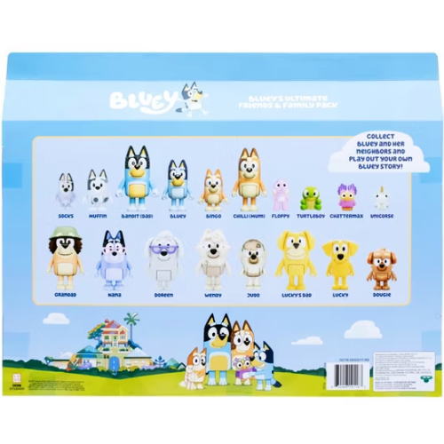 アメリカのターゲット限定で販売のブルーイ フレンズ&ファミリー フィギュア 18体セット。ブルーイ、ビンゴ、パパ、ママ、ラッキー、ラッキーのパパ、ジュドー、ソックス、マフィン、おじいちゃん、ナナ、ドリーン、ウエンディ、ダギー、フロッピー、カメさん、おしゃべりフクロウ、ユニコースの合計18種類です。オーストラリアMOOSE社製 サイズ パパで約7.8cm 日本国内未発売 正規ライセンス品 Bluey's Ultimate Friends & Family Pack