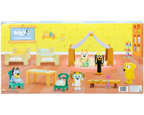ブルーイ プレイング・ドクター バリューボックス。ブルーイ、ビンゴ、ラッキー、スニッカーズ、ハニーの5体のフィギュアと11種類のアクセサリー類で医者になるためのロールプレイングが楽しめるプレイセットです。ステッカー附属。サイズ ブルーイ約6cm ボックス(58.5×30.5×6cm)はビッグサイズ! オーストラリアMOOSE社製 日本国内未発売 ウォルマート限定 正規ライセンス品 Bluey Playing Doctors Value Box (Walmart Exclusive)