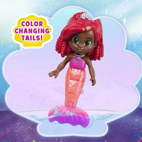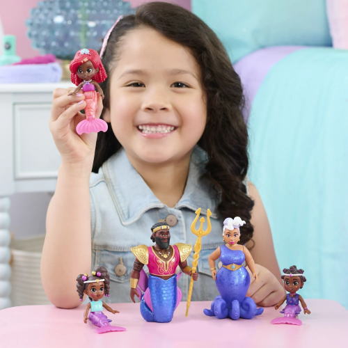 アリエル ロイヤルファミリー フィギュアセット。アリエル、トリトン、アースラ、アヤーナ、アラーナのフィギュア 5体とトライデント(三又の槍)のアクセサリーが付属しています。フィギュアの尾を水につけると色が変わります。サイズ トリトンやアースラで高さで約11cm Just Play 社製 正規ライセンス品