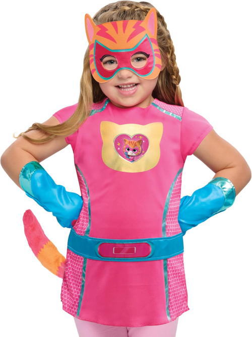 スーパーキティ ジニー スーパードレスアップセット/コスチューム。ジニーのピンク色のコスチューム、キャットマスク、青いグローブ2点、尻尾のセットでスーパーキティに変身! 素材 ポリエステル 100% サイズの目安 4〜6才 正規ライセンス品 Just Play 社製